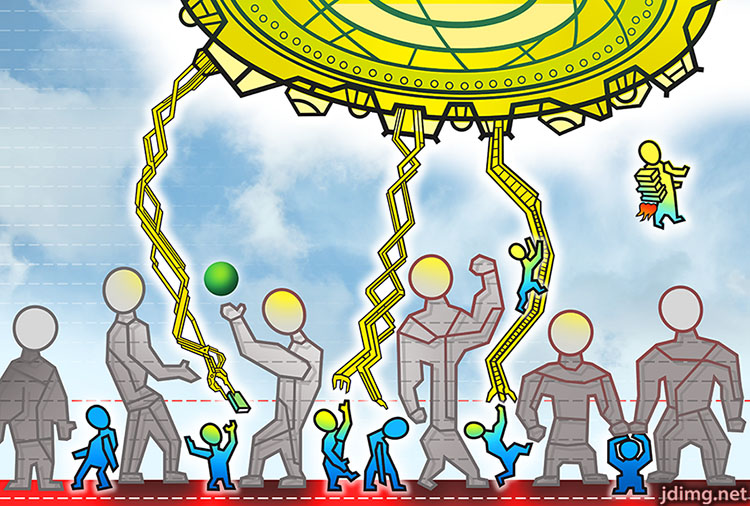 the image shows youngsters given help from the (somewhat idealised) Education System - look, one of them is already rocketing away, self-propelled by his backpack of books...